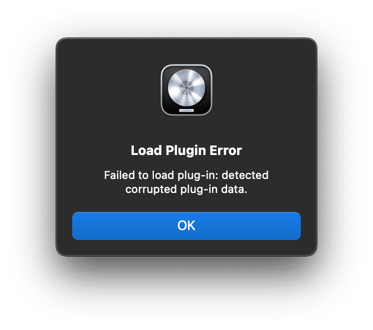 The tester reported that it installed okay. But when they try to open an instance of the plugin in Logic, they got an error saying: "Load Plugin Error. Failed to load plug-in: detected corrupted plug-in data." followed by a message saying to contact the manufacturer.