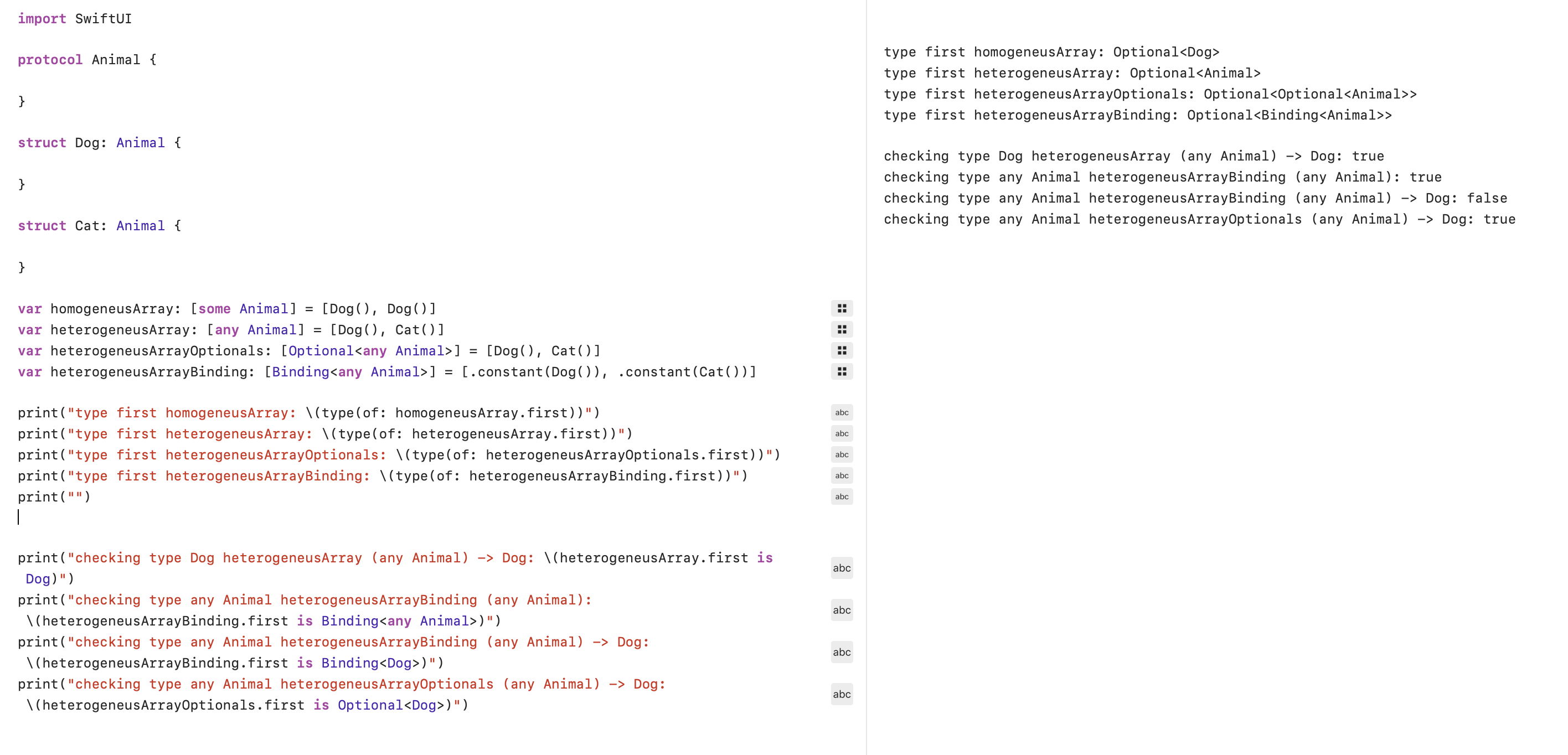 print("checking type any Animal heterogeneusArrayBinding (any Animal): \(heterogeneusArrayBinding.first is Binding<any Animal>)")