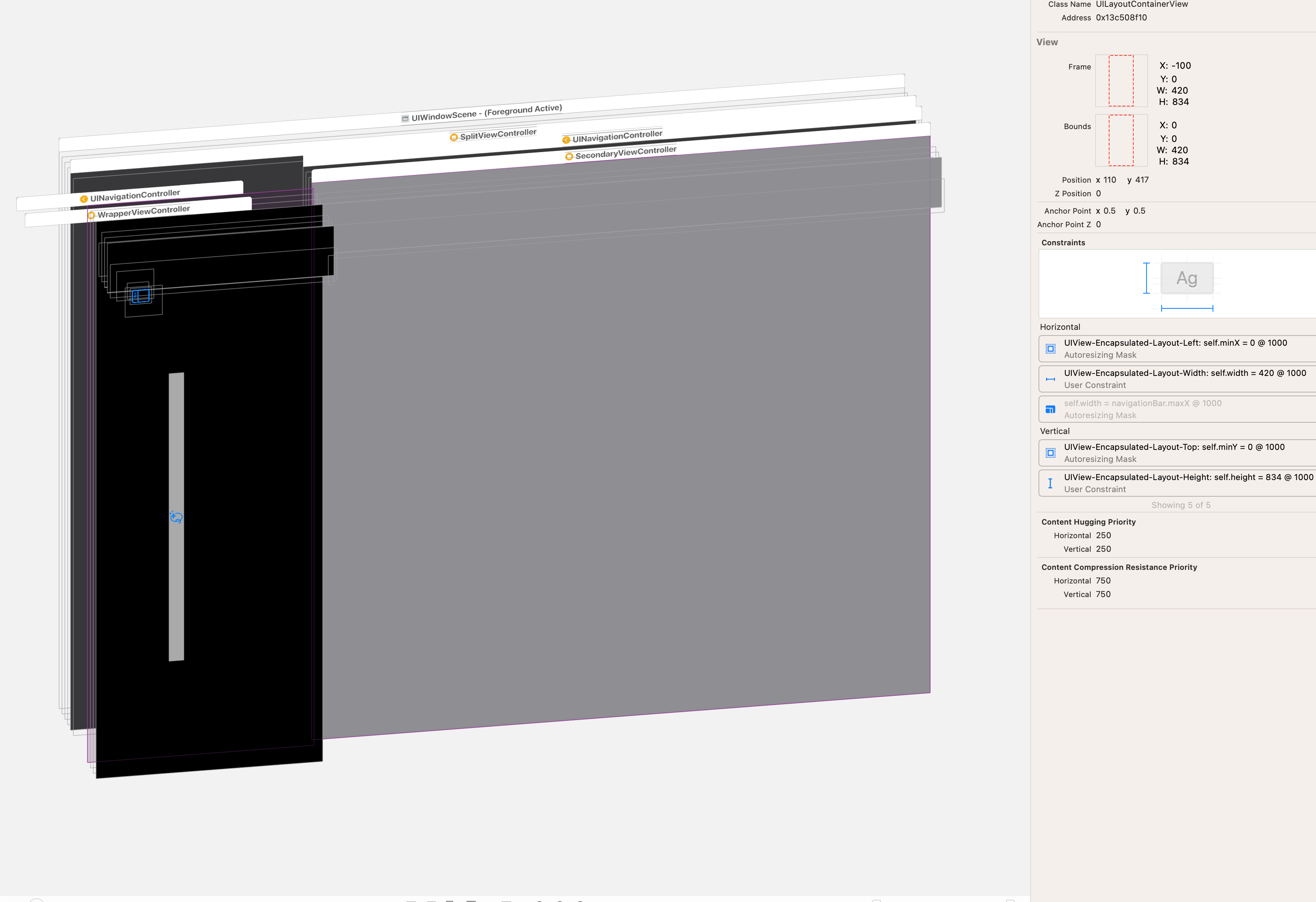 UISplitViewController creates a UINavigationController for primary view controller. However, the left side of the primary view controller is hidden, so I check the view hierarchy. The reason is that the x value of origin of the navigation controller is -100. Any one has clue? Or is it only me? It kept showing this wrong position on any iOS projects of mine. Please help.