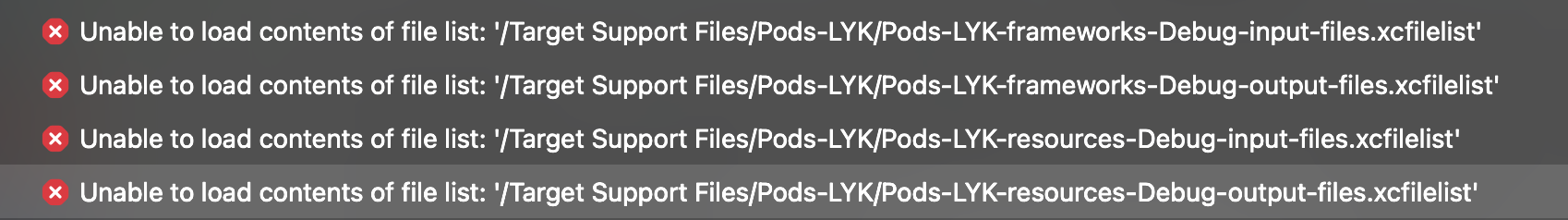 Unable to load contents of file list: '/Target Support Files/Pods-LYK/Pods-LYK-resources-Debug-output-files.xcfilelist'