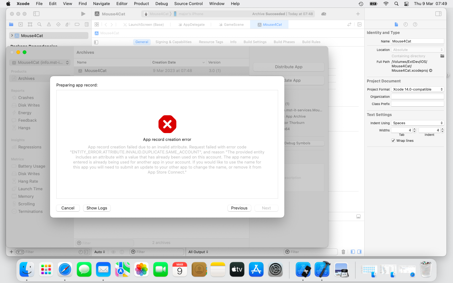 The log contains a number of lines like this 2023-03-09 07:48:36 +0000 [MT] Rejected distribution method <IDEDistributionMethodTVOSAppStoreDistribution: 0x60000dea8c30> because it doesn't support distributing archive Help please.