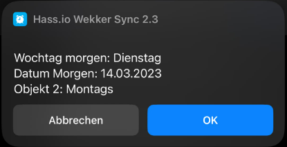 Englisch translation: weekday tomorrow: Tuesday (here is no 's' at the end of the weekday) date tomorrow: 14.03.2023 object 2: monday (but with the 's' in the end --> should be 'Montag'<-- this value comes from the alarm clock)