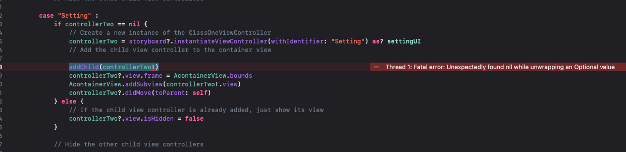 yeah... in function. If base on that image. I have this bug in UIViewContoller class "MyClass"(It's can call the function in UIViewContoller when user touch button in ViewContainer). and have a bug in addChild(controllerTwo!).