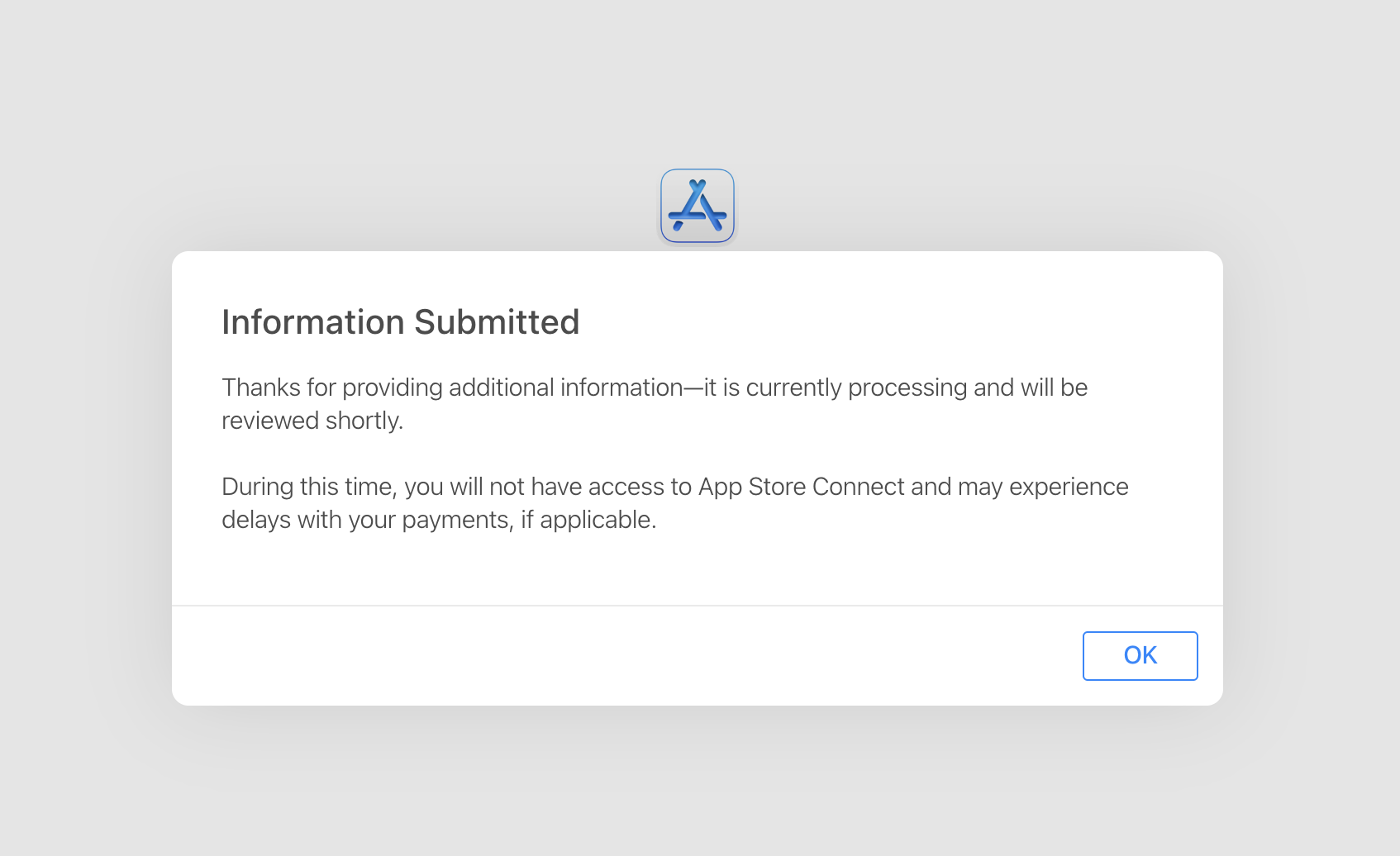 I I cannot log in App Store Connect, I always get this message Information Submitted Thanks for providing additional information—it is currently processing and will be reviewed shortly. During this time, you will not have access to App Store Connect and may experience delays with your payments, if applicable.