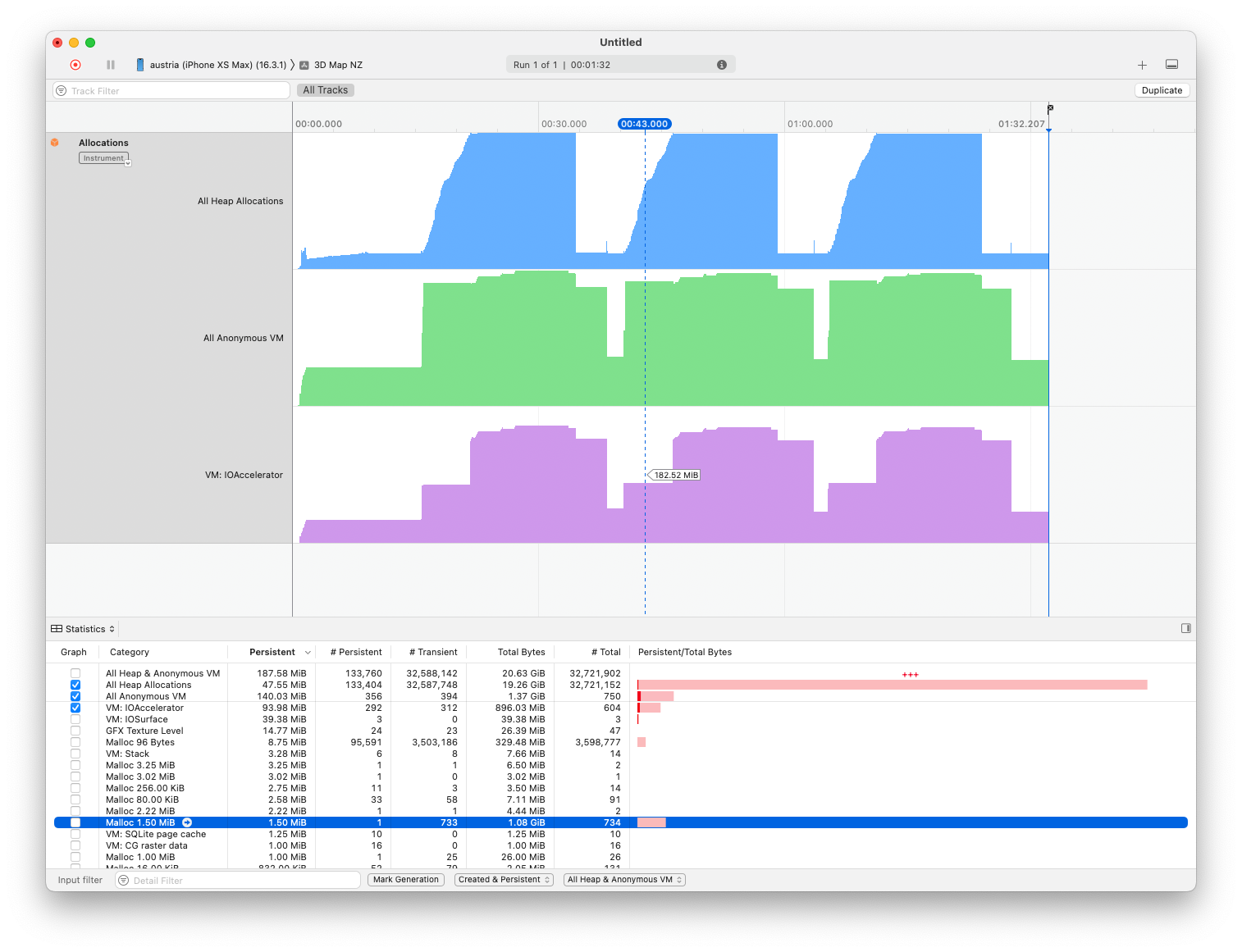 In the screenshot below, the green "all anonymous VM" graph is almost completely explained by the purple "IO Accelerator" graph (GPU buffers, textures etc) - but there are periods at the start of each cycle (such as at the cursor position) where there is some other contribution. I have not been able to find this in the other more-specific graphs.