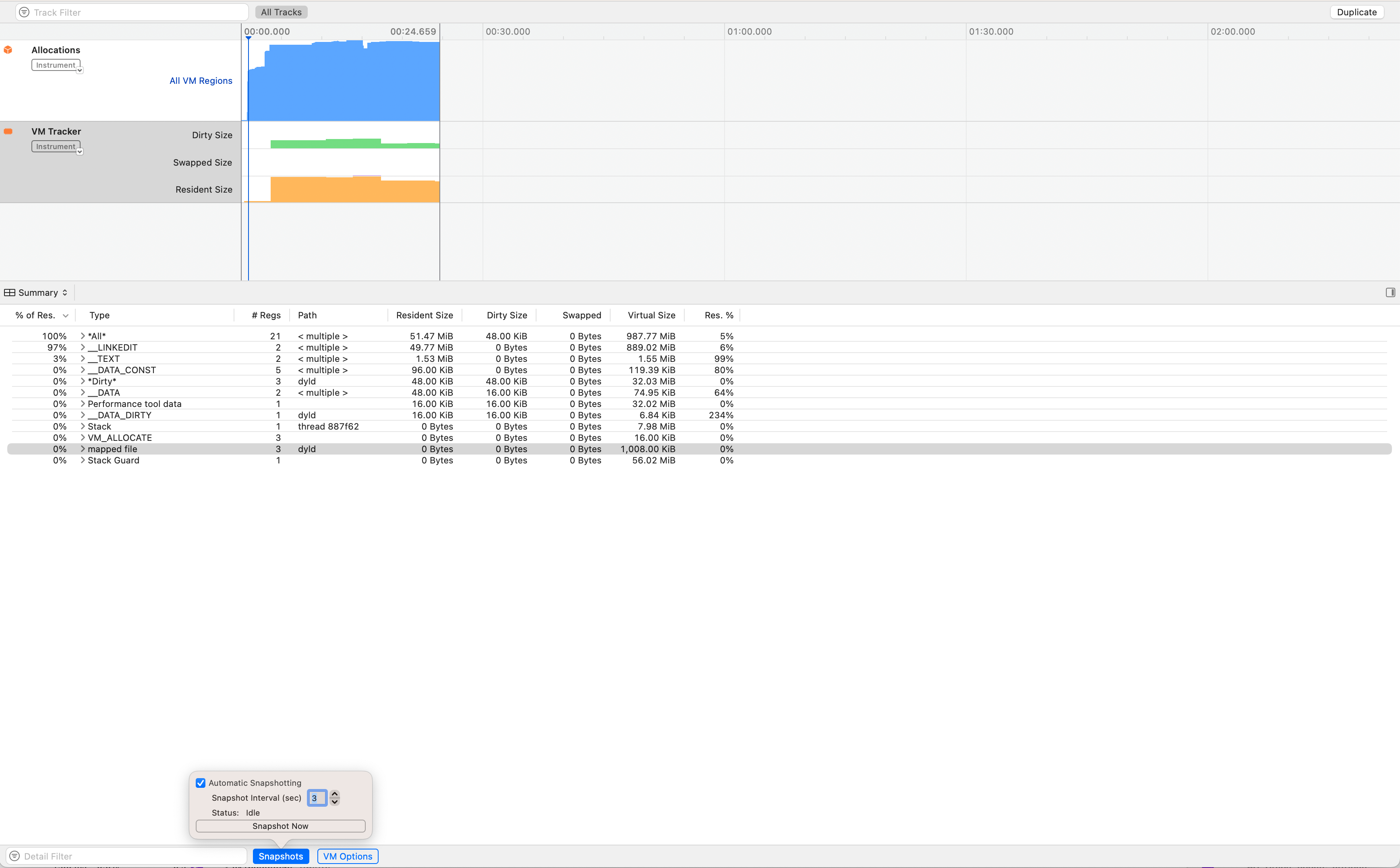 Any ideas anyone? I have been trying to make this app better behaved memory-wise and have made a lot of progress, in particular by removing periods when two large memory allocations co-exist, and by breaking work up into chunks. It now bothers me that there is 150 MB of "anonymous VM" that I cannot explain!
