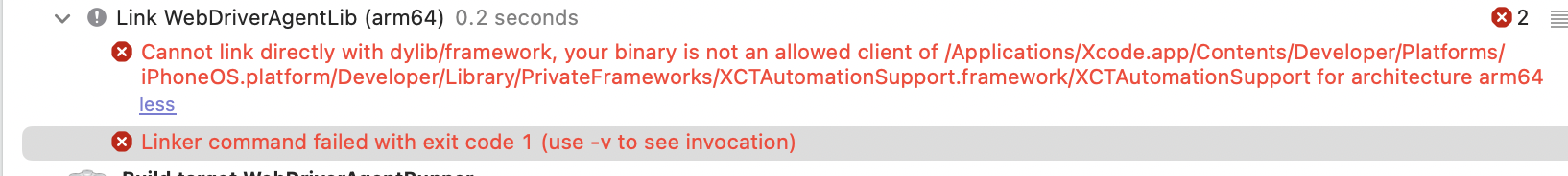 Error - Cannot link directly with dylib/framework, your binary is not an allowed client of /Applications/Xcode.app/Contents/Developer/Platforms/ iPhoneOS.platform/Developer/Library/PrivateFrameworks/XCTAutomationSupport.framework/XCTAutomationSupport for architecture armé64 Linker command failed with exit code 1 (use -v to see invocation)