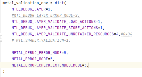 According to man MetalValidation I think you should set MTL_DEBUG_LAYER=1. MTL_DEBUG_LAYER_ERROR_MODE already should default to assert. However I don't think you want to set METAL_DEBUG_ERROR_MODE=5 (this is an older environment variable) -- I believe that value of 5 uses NSLog instead of asserts. I don't think METAL_ERROR_MODE should be used too. Please check the manual page and I suggest try only starting with MTL_DEBUG_LAYER=1, then add others that we document as needed to debug your issue.