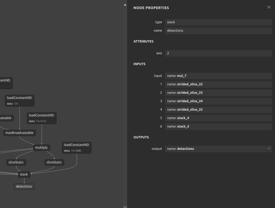 Input shape ('image_arrays' layer) is (1, 320, 320, 3) - image type Output shape ('detections' layer) is (1, 100, 7) - containing 100 rows with bounding box coords, class_id, score, and another variable, altogether 7 floats)