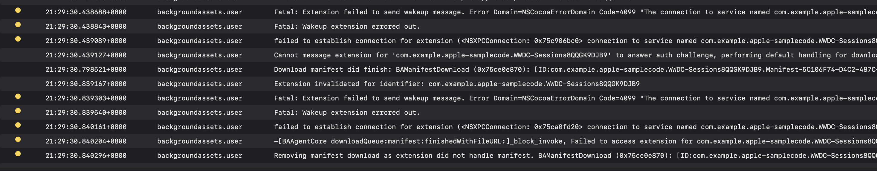 backgroundassets.user Removing manifest download as extension did not handle manifest. BAManifestDownload (0x75cd44aa0): [ID:com.example.apple-samplecode.WWDC-Sessions8QQGK9DXXX.Manifest-3BE0D398-734D-4E12-90DD-EE943D6DCXXX, AppID:com.example.apple-samplecode.WWDC-Sessions8QQGK9DXXX, Necessity:Essential]