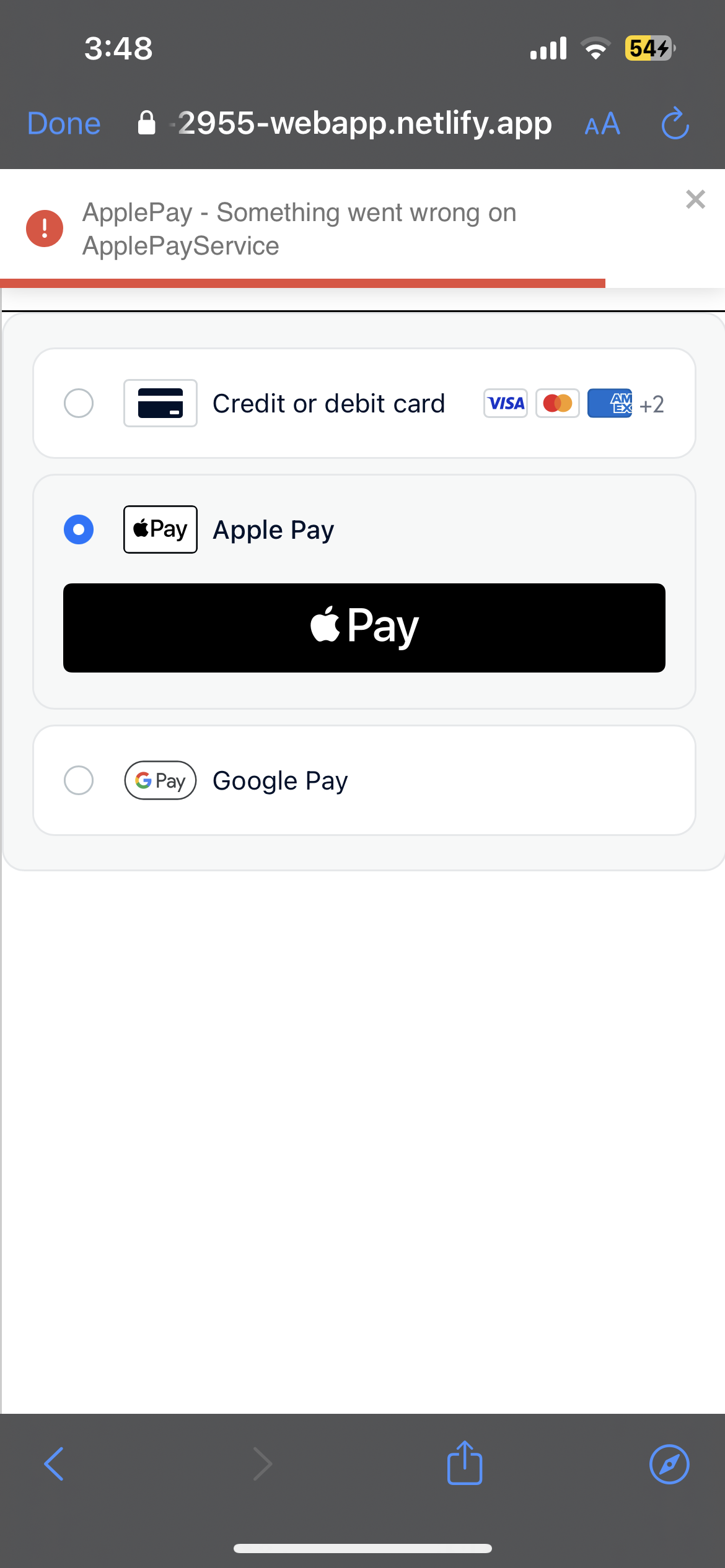 On the working domain, users can complete payments using Apple Pay without any issues. However, when attempting to make a payment on the problematic domain, the payment sheet opens briefly and then immediately closes