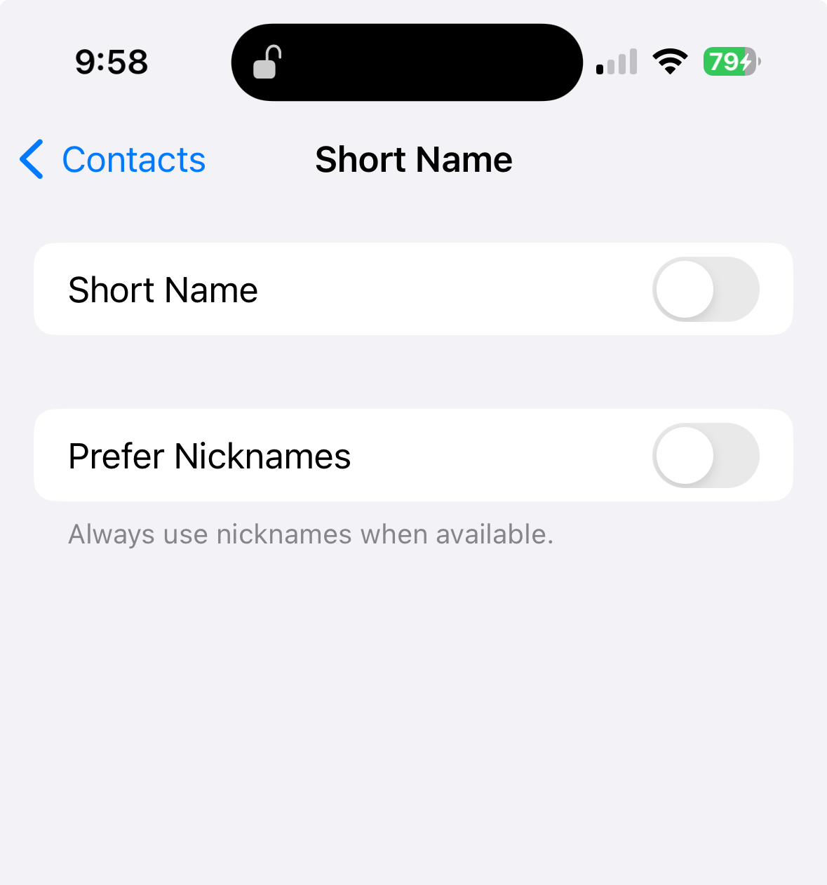 I don't think I experienced this behavior on iOS 16, so I am wondering if anyone else is getting this. Calls (incoming and outgoing) to a contact only show the first name of the contact instead of the full name. I have turned off (I think) all the Short Name settings (see screenshot). Is this an iOS 17 bug? Or is there a different setting I am missing? I have confirmed with someone on iOS 16 that he has full names show up on the call screen.