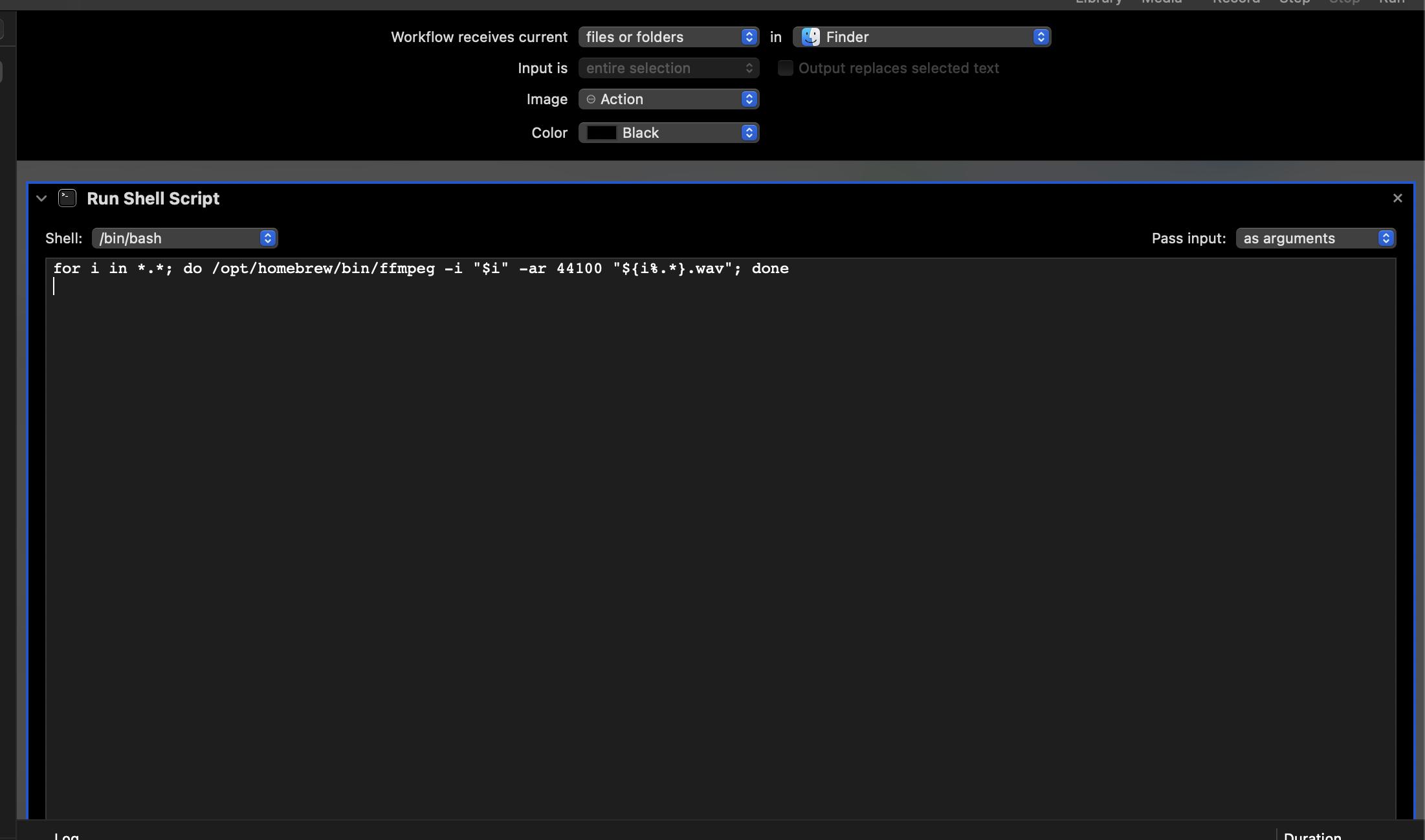 I am a recent convert to the Mac ecosystem, I have a windows batch script from when I was using windows that i would like to adapt to an automator script. It is pretty simple. The goal of is about using ffmpeg to convert media files to the proper WAV format for a sampler I have. Essentially what it does is allow you to right click on a file in a folder, and the script looks through all media files in that folder, then creates a new folder in an exports folder, and converts all the files to 44.1 khz wav files and places them in the few folder. An additional wrinkle of my original script that isn't completely necessary is that it queries you about whether you want to use the original folder name or create a new one.