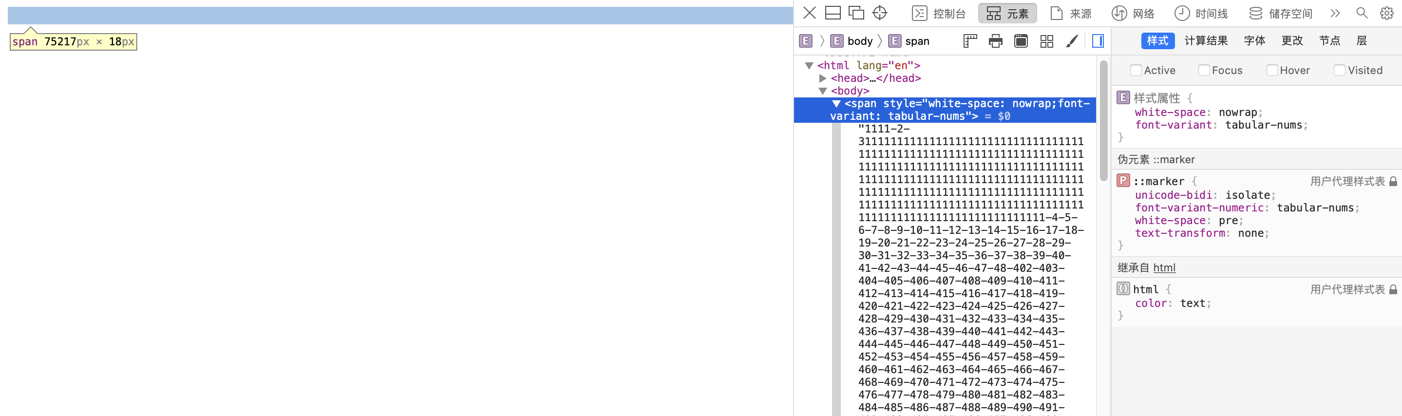 Steps to reproduce: type text of more than 10k chars (10240 chars) and style set to: "white-space: nowrap;font-variant: tabular-nums"
