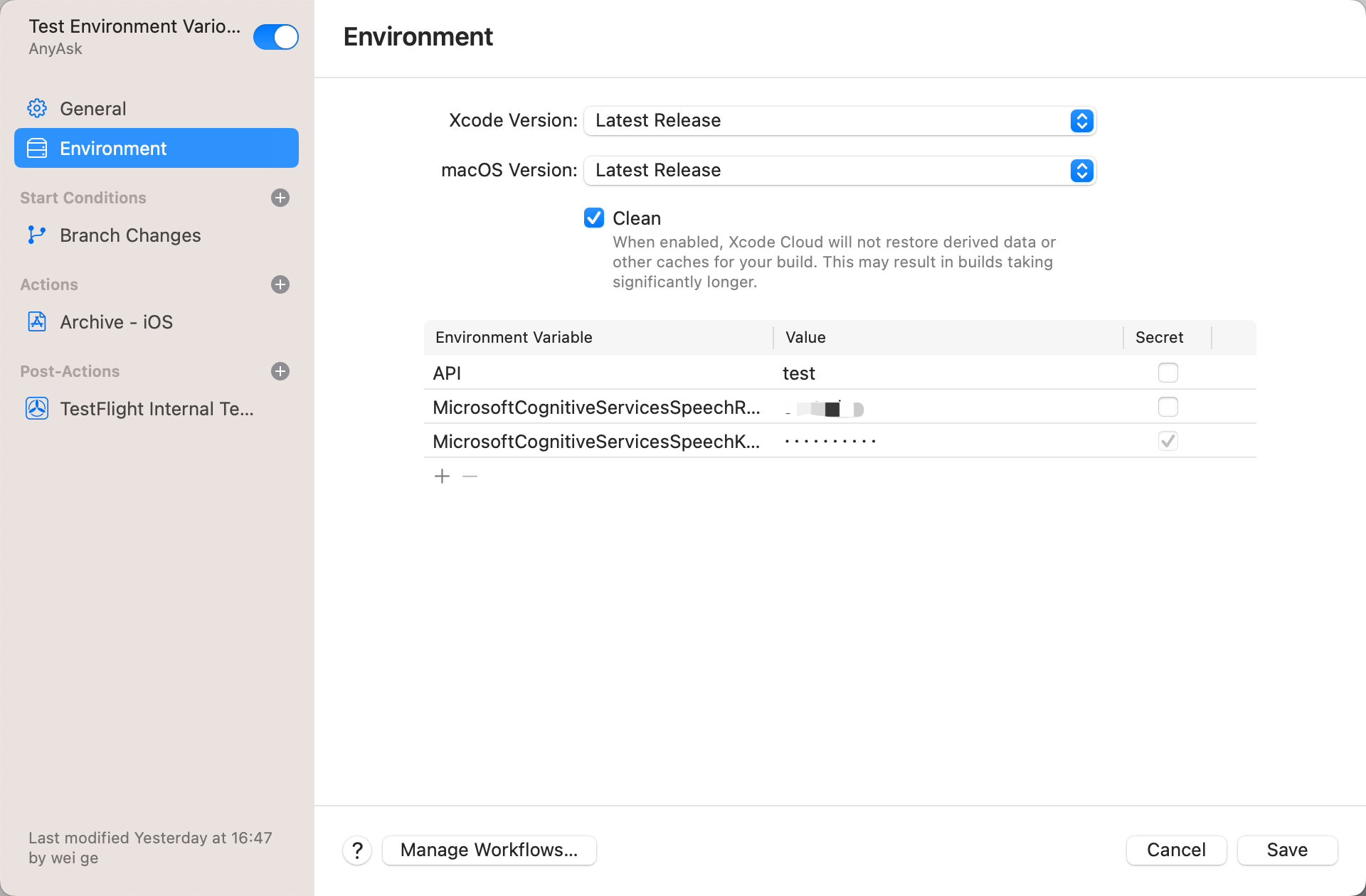 This is where the environment variables are set in the Xcode Cloud. I right-clicked on the workflow in the Cloud tab found in the Report Navigator of the Xcode and selected "Edit Workflow":