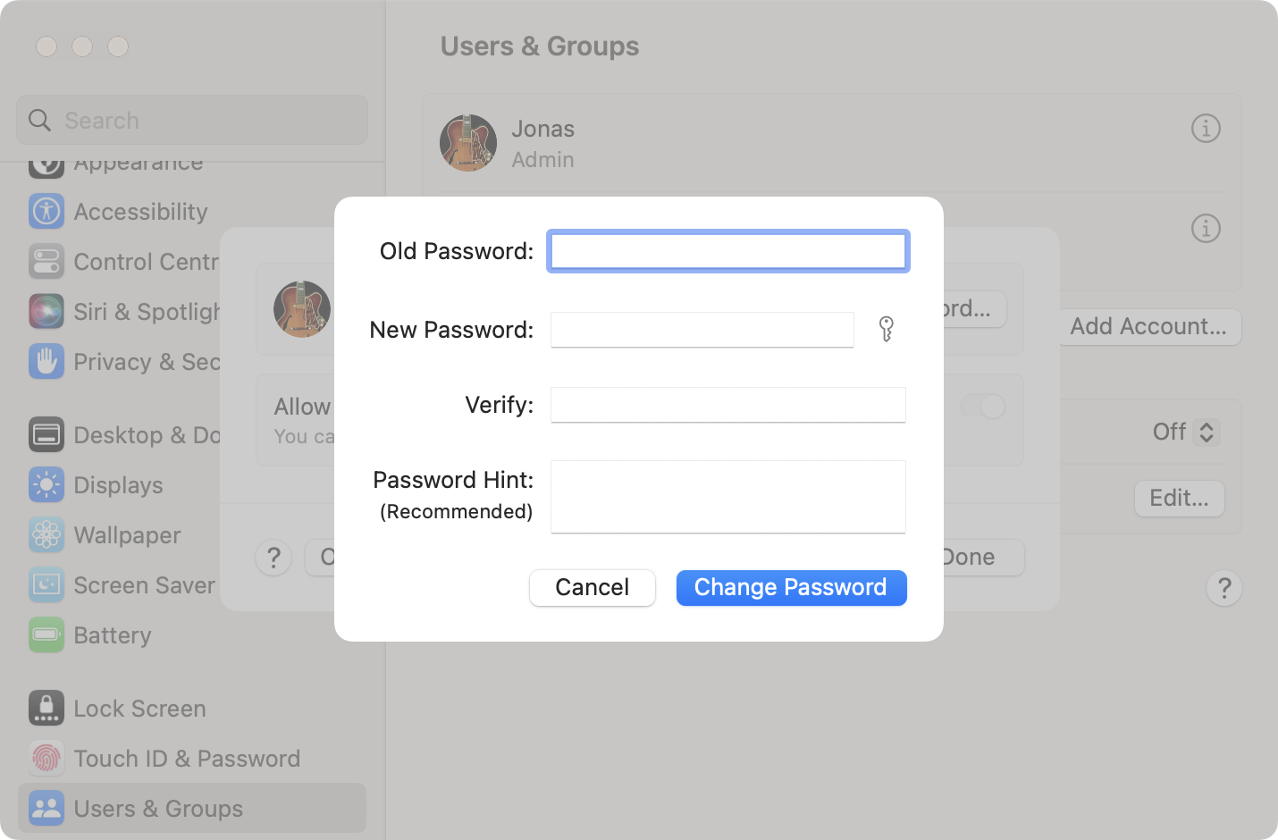 The main problem is to go from Users and Groups in System setting to the account detail where you can click the button for changing password. Anyone have any idea?