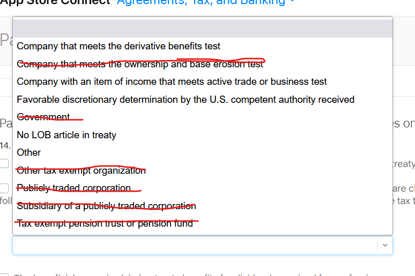 I have a Pty Ltd company based in South Africa with a singular owner and I'm trying to complete the US Tax Forms but I'm stuck on two of the questions. First, the dropdown below. I've removed the options I don't think apply but I don't know which of the other options apply to my company.