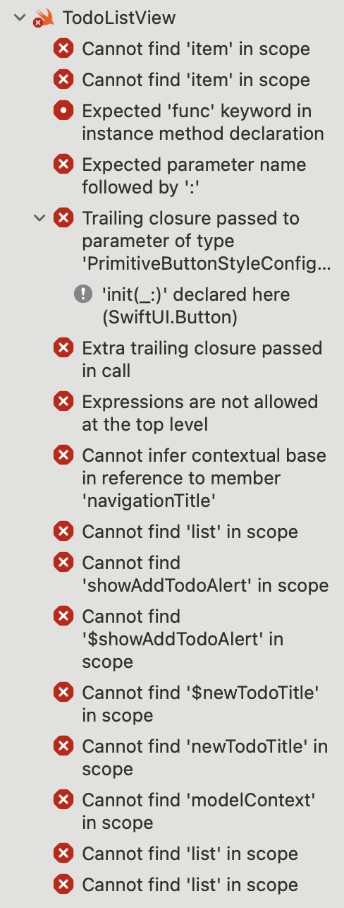 I was converting a SwiftUI view to use persistence with SwiftData when I got 17 errors in Xcode! I have no idea what happened when I got those errors, and there were too many to search up, so I decided to ask here. So can anyone help me? Here is the code: