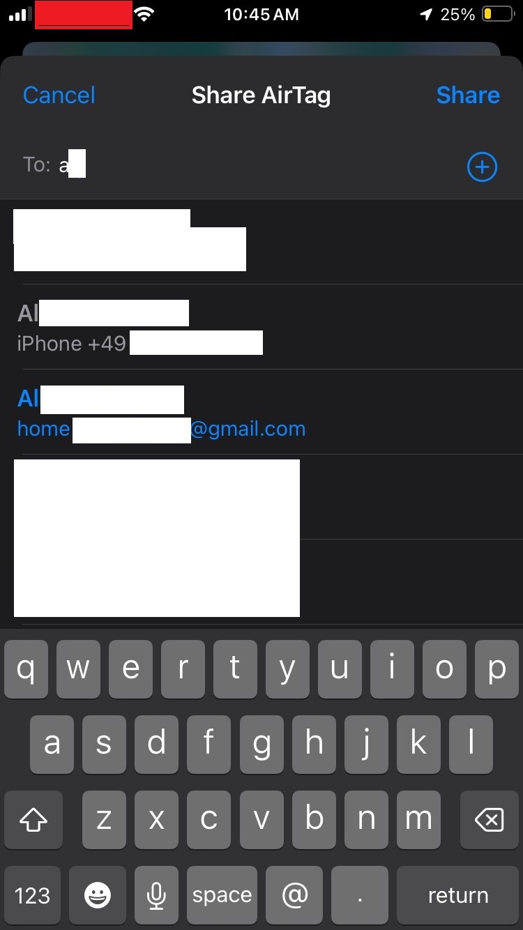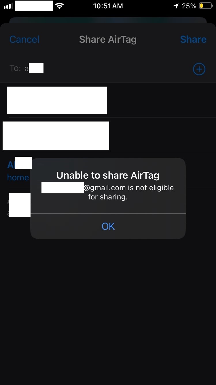 However, when trying to do so with my wife, her phone number is greyed out. I can't click on her number. She has an iPhone 8. Not sure if that could be the reason. Her e-mail address is blue, however, when I select the mail-address, an error message comes up "email is not eligible for sharing".
