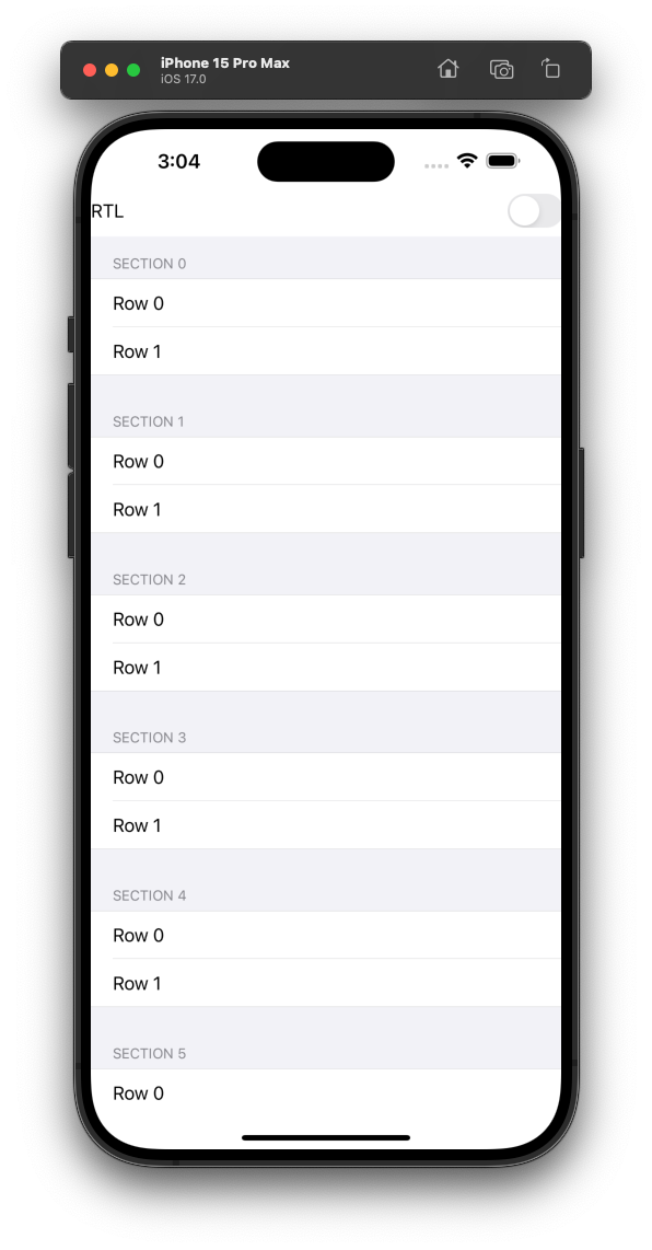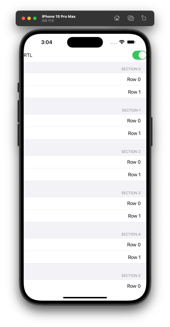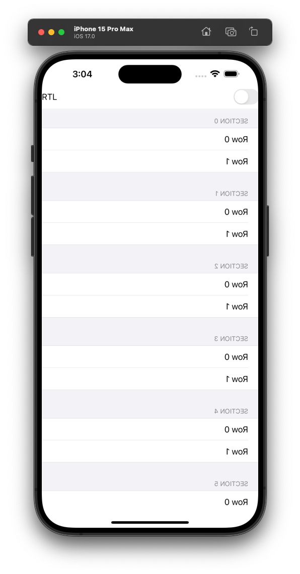 I have noticed weird behaviour of List on iOS 17 when \.layoutDirection is changed. It appears that frame of child views in List is wrongly updated. Below I include code and screenshots representing the problem.