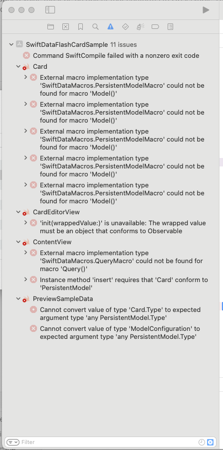 I'm following the Build an app with SwiftData from WWDC 2023. I'm using the Xcode release candidate for Xcode 15. i'm running the Developer Beta for Sonoma. The first change was to import SwiftData, add the @Model macro to the Definition for the Card object and remove @Published from two variable in the definition. After doing this I get 5 errors: External macro implementation type 'SwiftDataMacros.PersistentModelMacro' could not be found for macro 'Model()' The instructions continue to the CardEditorView and change the macro for var card to @Bindable with the error 'init(wrappedValue:)' is unavailable: The wrapped value must be an object that conforms to Observable Then we move to the App main class where we add .modelContainer(for: Card.self) and get the error No exact matches in call to instance method 'modelContainer' Any clue why this is happening?