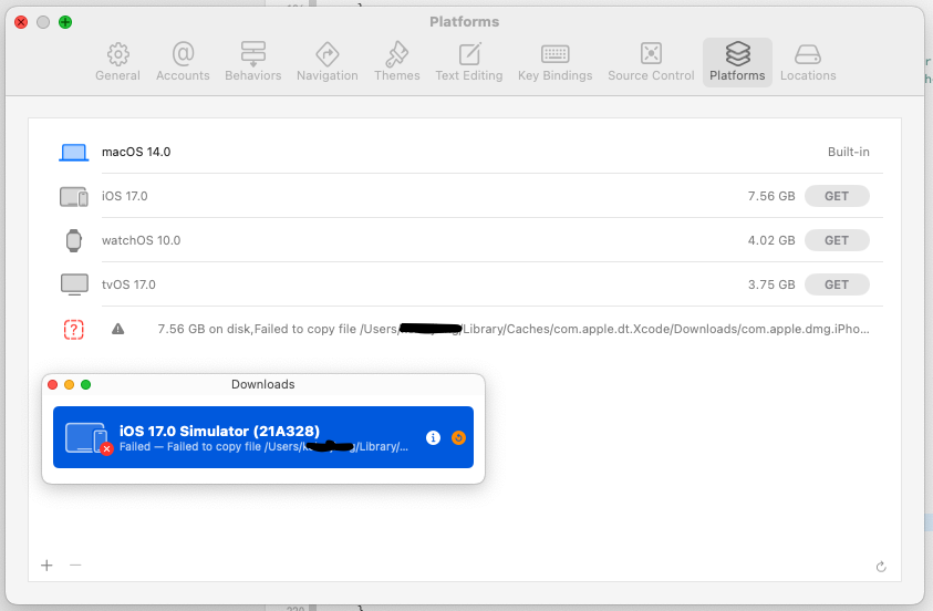 Failed to copy file /Users/kelanjiang/Library/Caches/com.apple.dt.Xcode/Downloads/com.apple.dmg.iPhoneSimulatorSDK17_0-17.0.0.0.dmg to /Library/Developer/CoreSimulator/Images/Inbox/43457D23-59DB-496A-B682-85D8F92F4FC7.dmg.copying