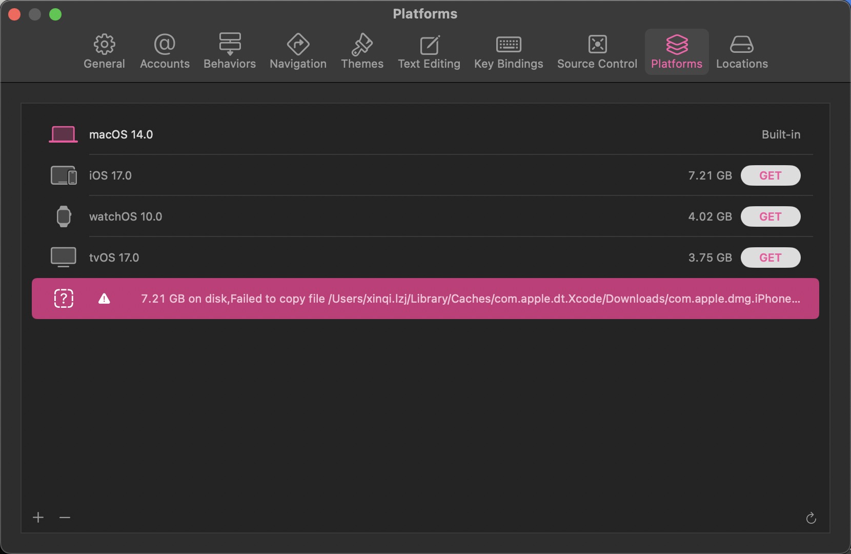 unusableErrorDetail = "Error Domain=NSPOSIXErrorDomain Code=2 \"No such file or directory\" UserInfo={NSLocalizedDescription=Failed to copy file /Users/kelanjiang/Library/Caches/com.apple.dt.Xcode/Downloads/com.apple.dmg.iPhoneSimulatorSDK17_0-17.0.0.0.dmg to /Library/Developer/CoreSimulator/Images/Inbox/43457D23-59DB-496A-B682-85D8F92F4FC7.dmg.copying}";