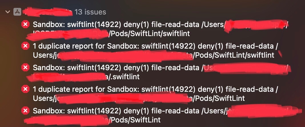 I've been working with SwiftLint, which I've installed into Xcode through CoocoaPods, I think I might've messed up the build settings, I don't really remember, but has anyone run into the same issue, any suggestions on how to fix it?