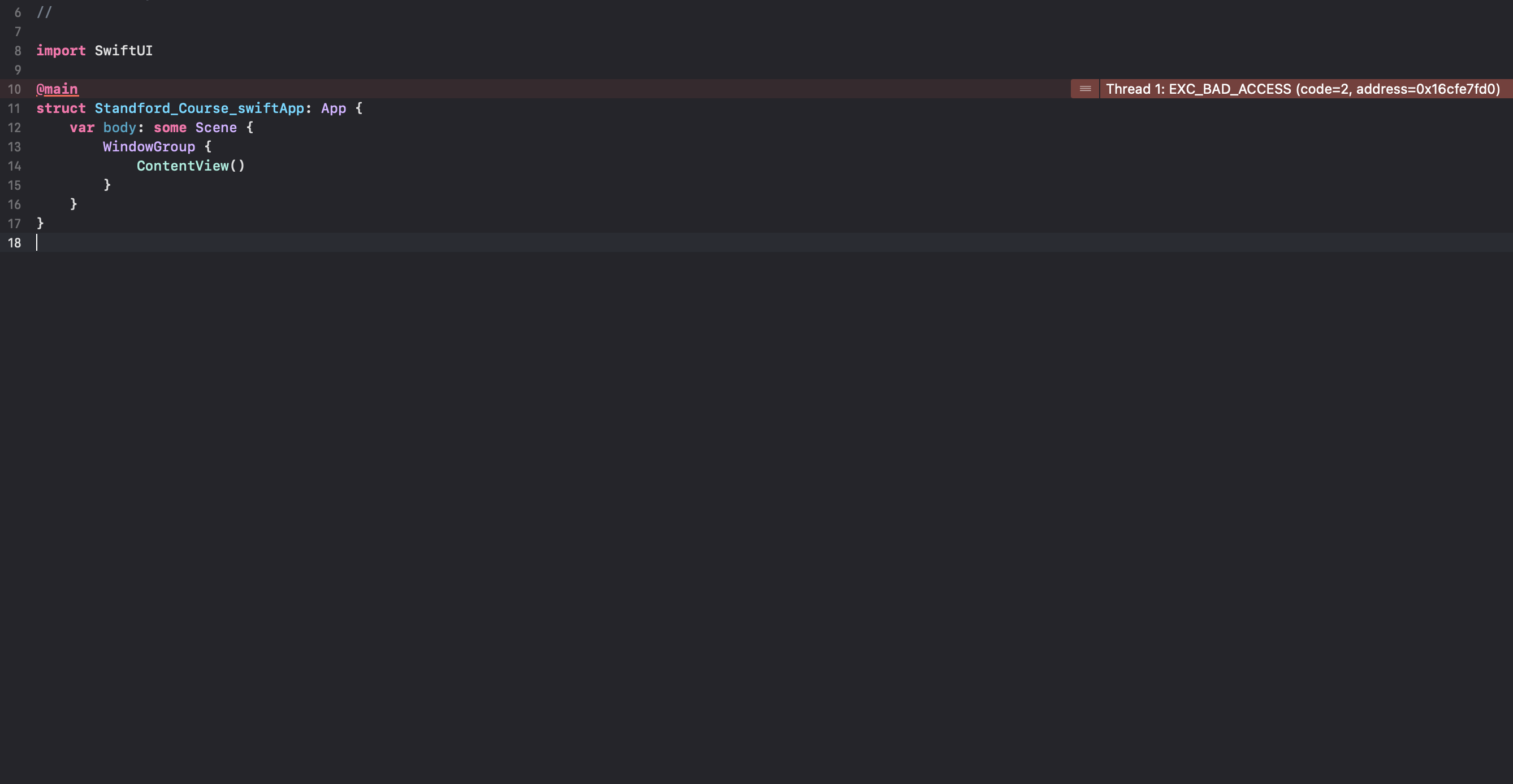 I'm getting the - Thread 1: EXC_BAD_ACCESS (code=2, address=0x16ca83ff0)- error on my @main line. Any solutions?