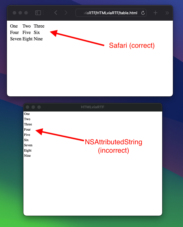 The problem is that the NSAttributedString used to be able to load HTML files correctly via the [NSAttributedString initWithHTML:options:documentAttributes:] method (or its Swift equivalent). As of the developer beta of Sonoma, however, this no longer works. The method loads the attributedString but HTML tables are completely ignored. Every cell in the table just appears on a new line.