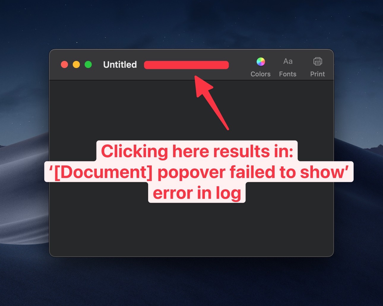 Essentially, when you have an Autosaving NSDocument that opens an NSWindow containing an NSToolbar the default 'Unified' toolbar style places the Document title to the left of the Toolbar. When the titlebar is laid out like this, there is a clickable area to the right of the title. If the user clicks in this area a log error appears that reads '[Document] Popover failed to show'