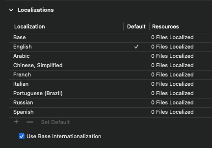 On Xcode (15.0.1), in the app file, info, localization section I see that all languages are there with green checkmarks, except English which is at the top and is the default language.