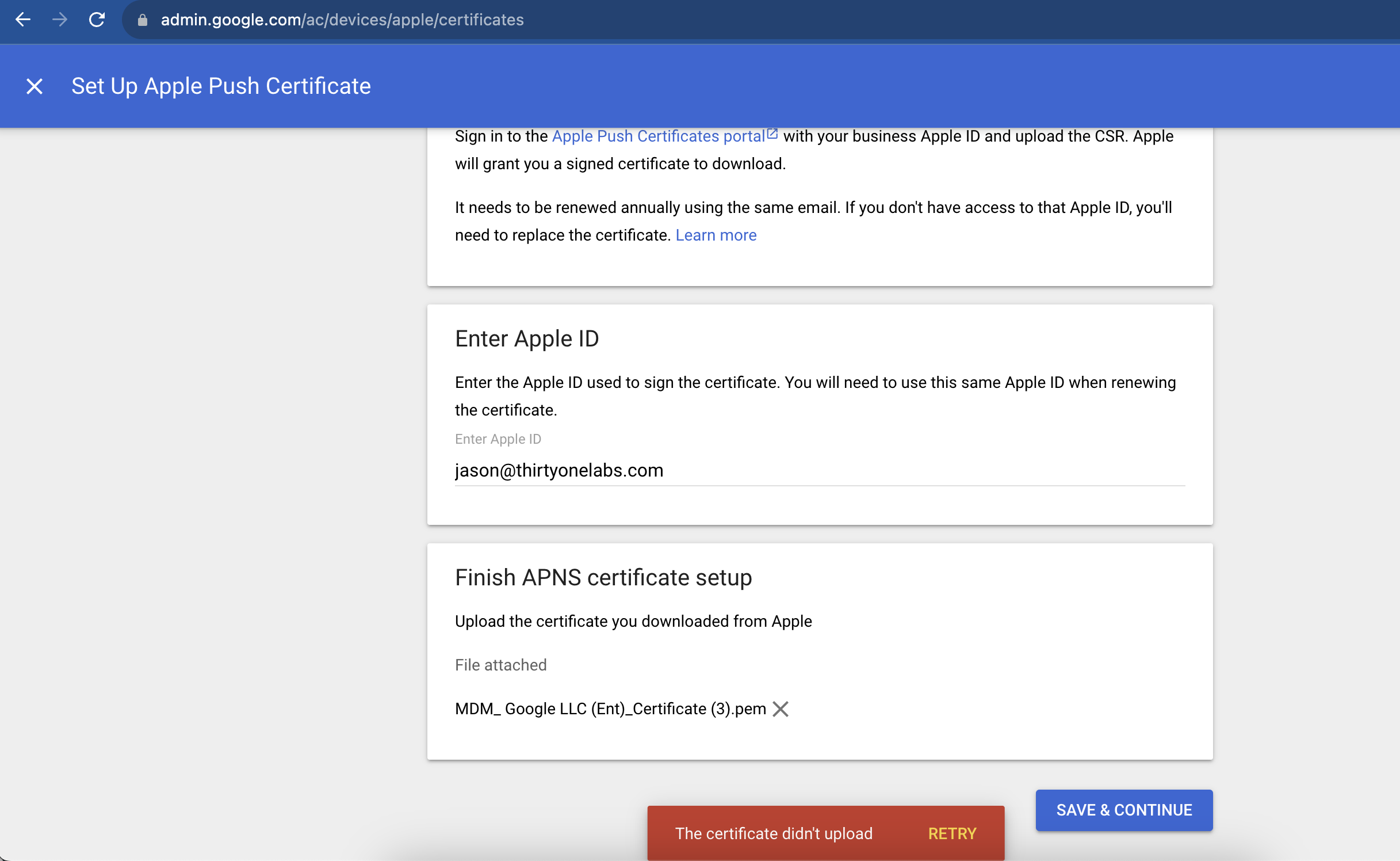 We uploaded the certificate received from the Apple Push Certificates Portal but keep coming up with an error message: