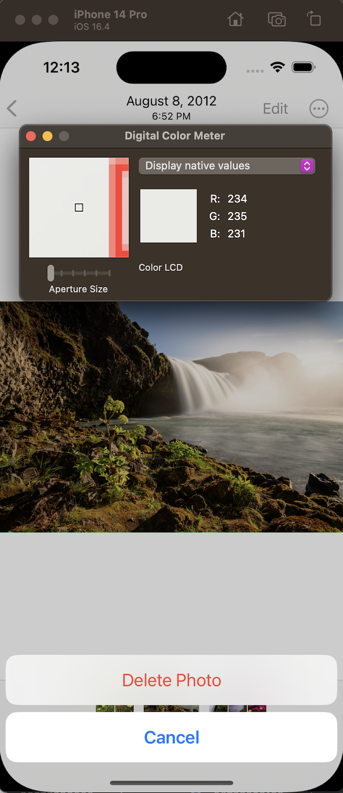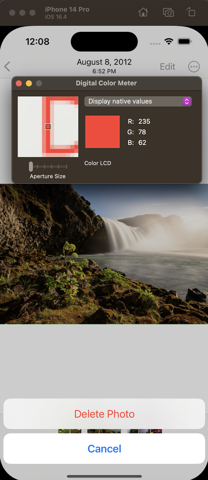 Here is an example of the Photo app alert. The text "Delete Photo" (#EB4E3D) should have a contrast ratio of at least 4.5 to 1 against its background(#EAEBE7) to comply to the Web Content Accessibility Guidelines (WCAG).