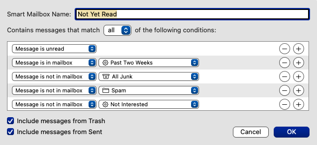 In Apple Mail V16 in Sonoma V14.2.1, what does it mean for a Smart Mailbox to have zero messages, but 39 unread?