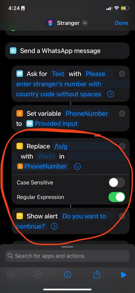 Which RegEx pattern convention is used for Replace action in Shortcuts