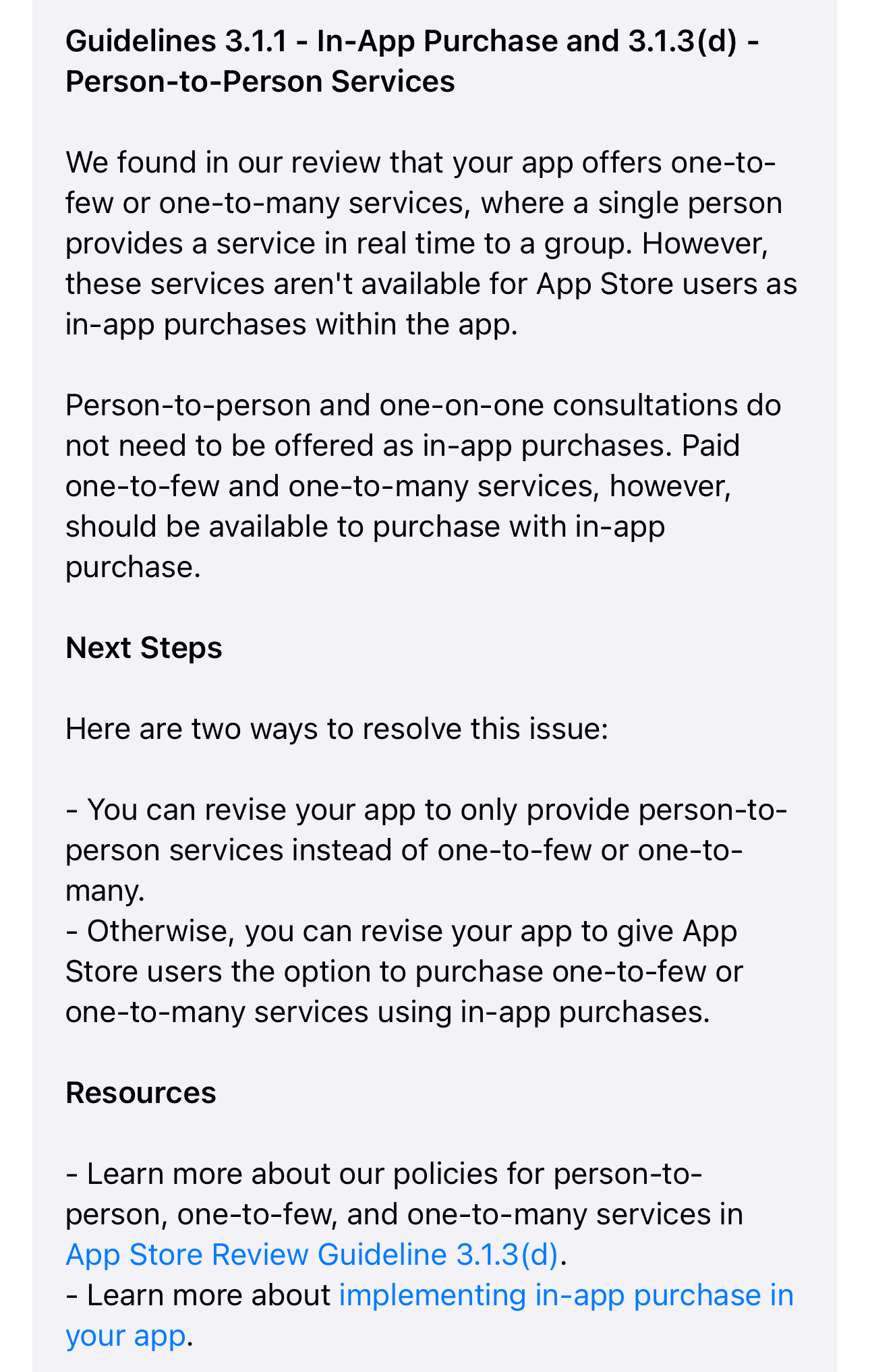 For GUIDELINES 3.1.1.: I don't know how i can resolve, because there are more apps that is paymant using browser on app without use in-app purchase, example the apps SUPERENALOTTO when I pay, open a window browser with type of payments (especially out the app), the app ENI PLENITUDE when there is a bill to pay, can pay with Apple Pay on app but how can I specify the price on in-app purchase if the price is not fixed but occurs based on the cost of the bill. On in-app purchase there are the price that I have to insert from $0.99 to up. Please can you help me? Because, yesterday I have change on app the payment on browser but they rejected it anyway.
