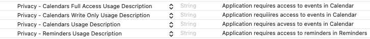 NSCalendarsWriteOnlyAccessUsageDescriptionHowever, even though I have both the NSCalendarWriteOnlyAccessDescription, adn the older NSCalendarUsageDescription as shown here: