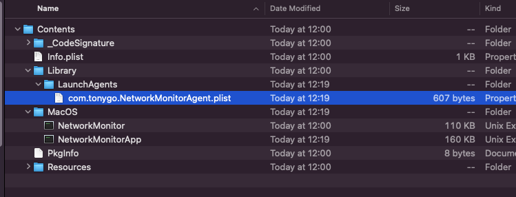 Don’t put code, in this case the NetworkMonitor executable, in Contents/Resources. See Placing Content in a Bundle for info on where it should be.