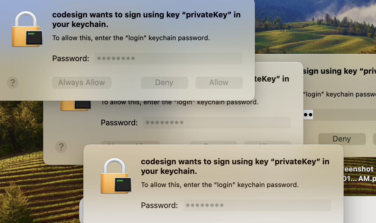 I'm attempting to build and have lots of code sign dialogs pop up. I'm entering the correct password and selecting Always Allow (selecting just Allow doesn't make any different) but they won't dismiss, instead more appear.