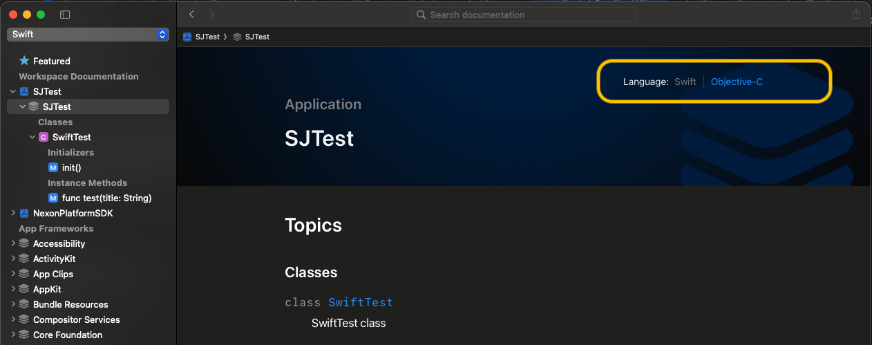 I created a doccarchive that supports objc and swift using xcode build setting DOCC_EXTRACT_SWIFT_INFO_FOR_OBJC_SYMBOLS. When I made a docc document, I can select objc or swift on Xcode documentation like the yellow box of the below image.