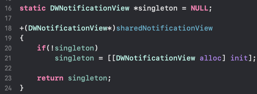 static DWNotificationView *singleton = nil; //nil and NULL are supposed to be the same but nil is preferred for objects in Obj C