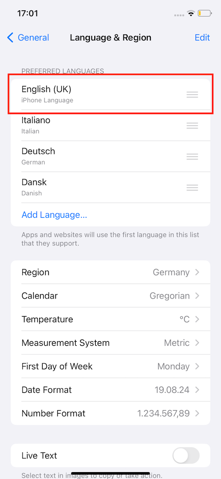 Here I want to obtain english, since that's the device language (see next screenshot).