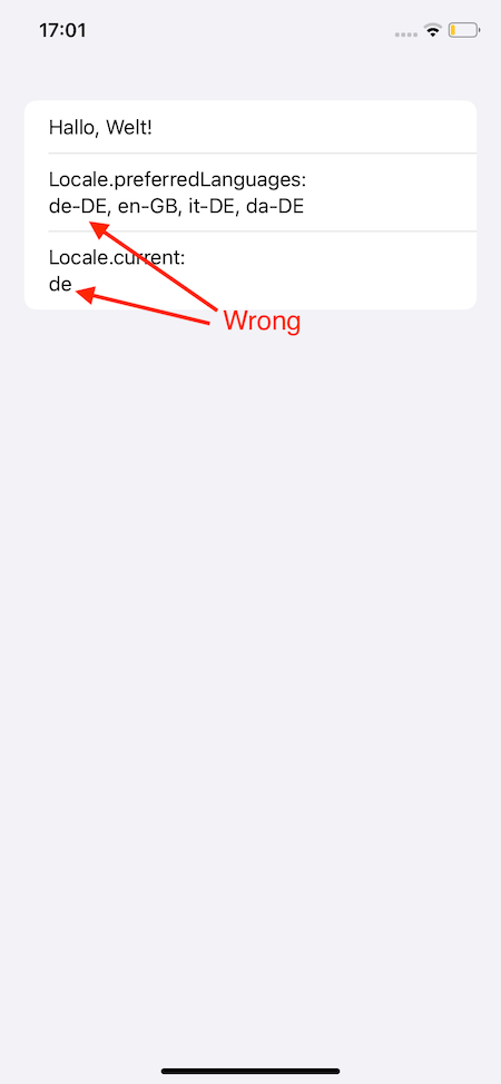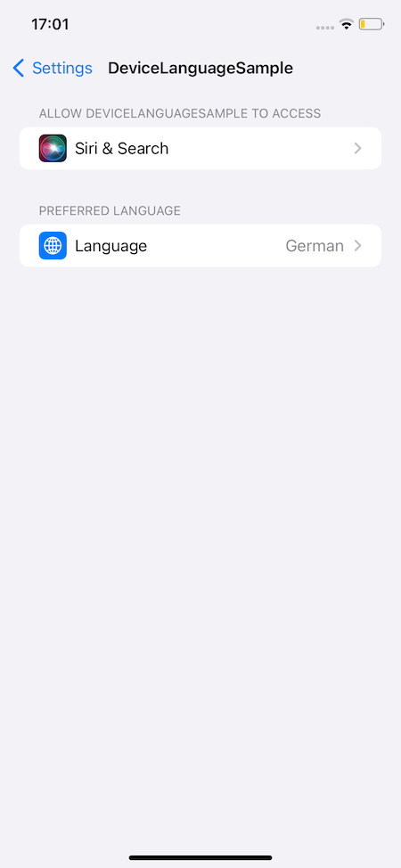 I have an localized iOS App from which I want to obtain the device language (not the app language). The following sample app is localized in English and German. The current app language is German.