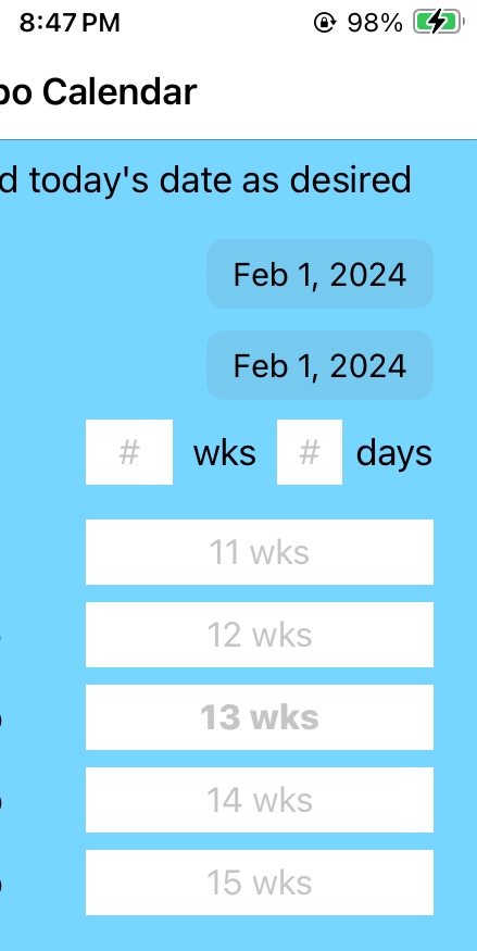 @myuncle: Good idea, I could do the stack view. But I still don't want the gray rounded rectangle around the black lettering of the dates themselves in the date pickers. Still haven't figured out how to handle this. --JS