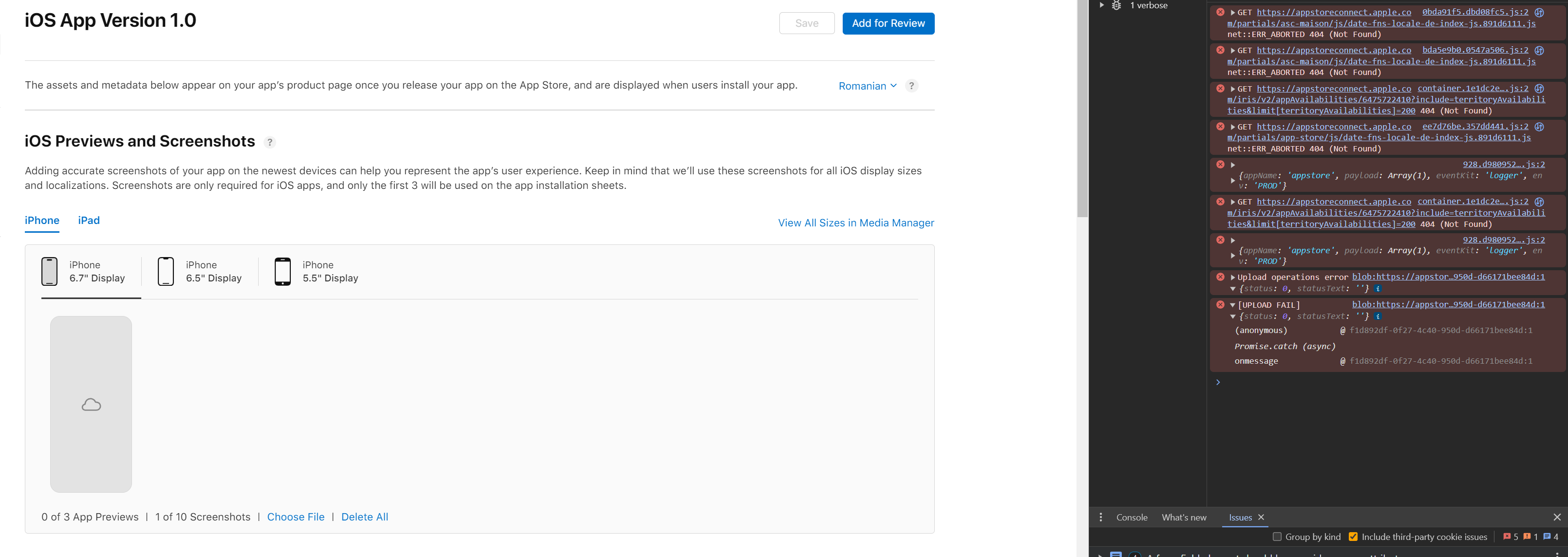 I am trying to upload screenshots for our first build validation in the "Prepare for Submission" page, but the image disappears after I drag it in the uploader. When I refresh the page there is a gray placeholder with a cloud icon. When checking the console after dragging an image to the uploader, I can see a "Upload operations error" error and a "[UPLOAD FAIL]" error, but there's no additional info.