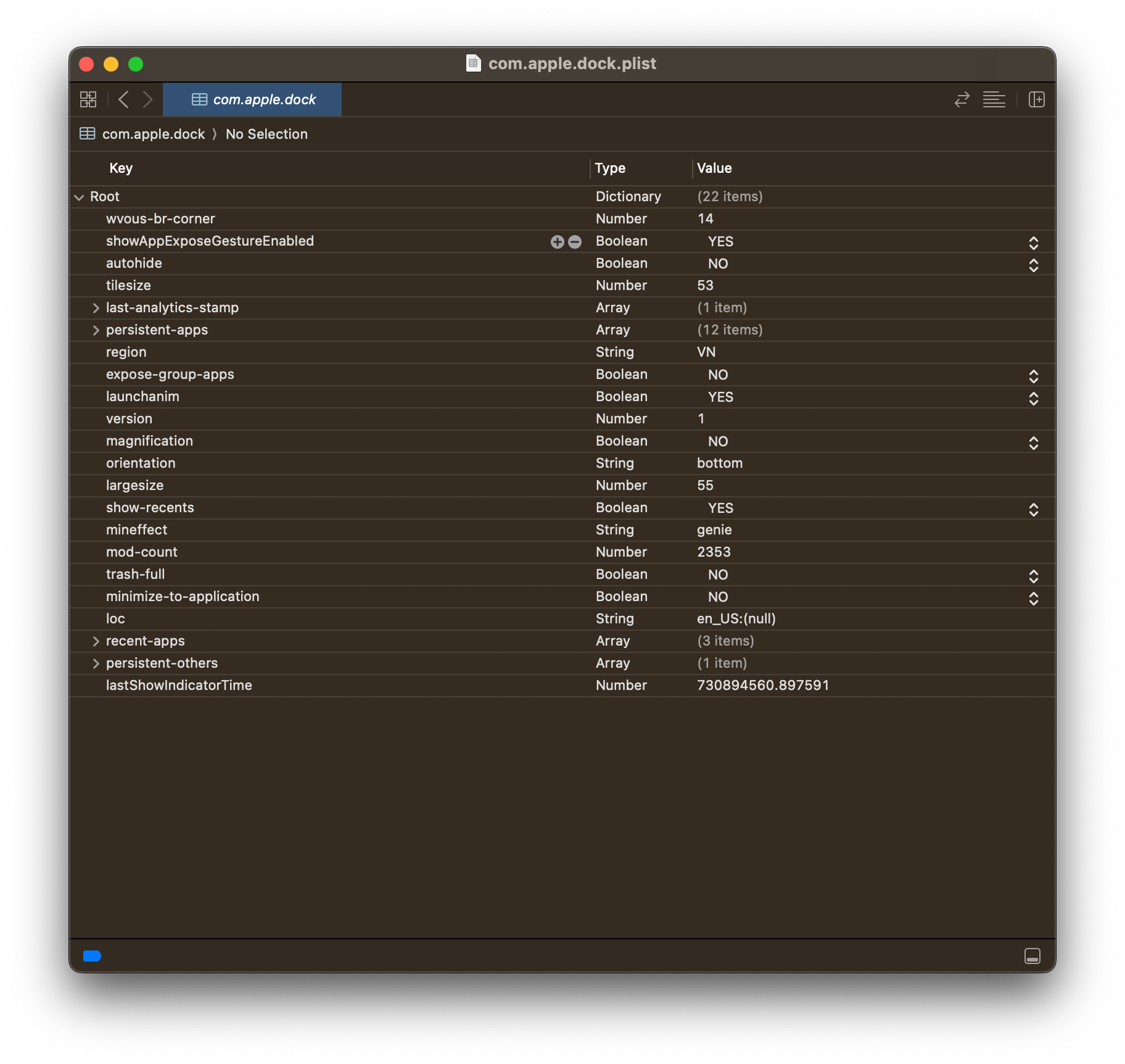 Hi there, Currently, we are working on the enterprise project that using data in ~/Library/Preferences/com.apple.dock.plist to get detail design of the original Dock (as autohide, orientation).