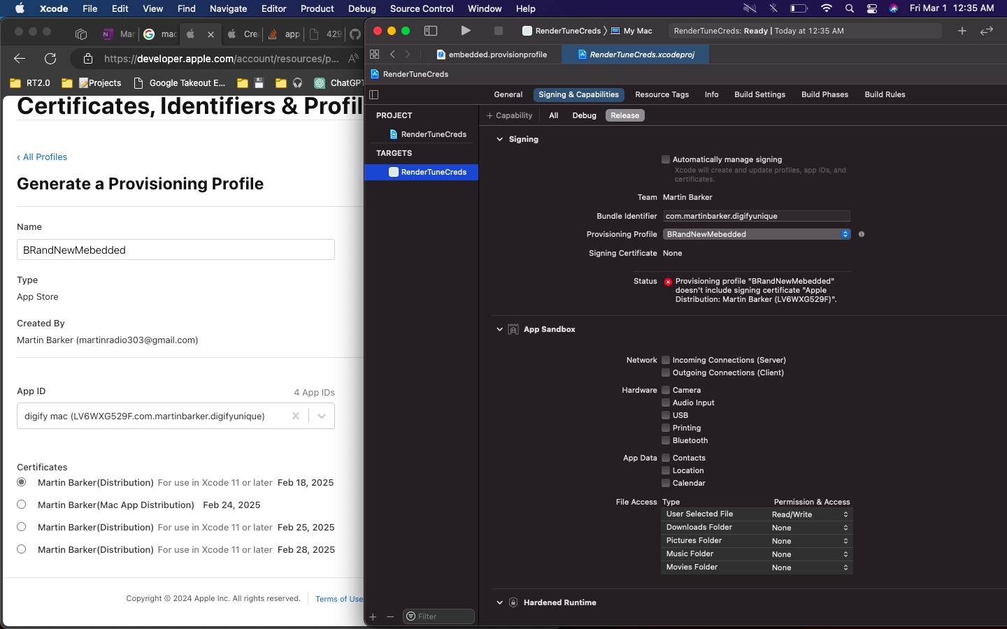 Provisioning profile "BRandNewMebedded" doesn't include signing certificate "Apple Distribution: Martin Barker (LV6WXG529F)".