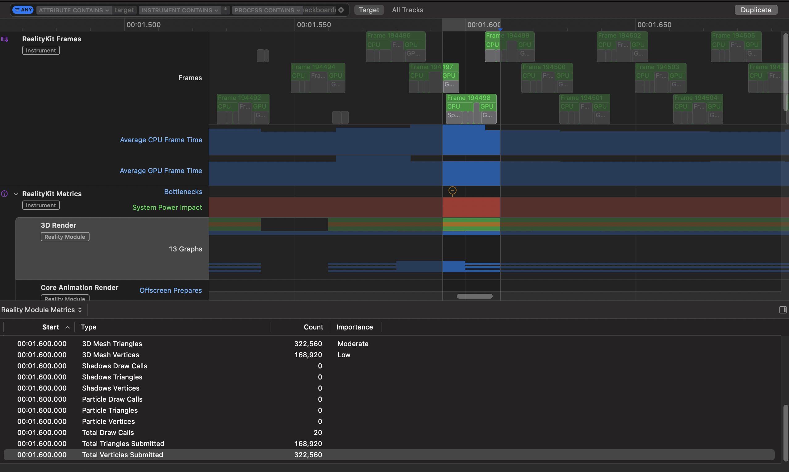 To test I made a base visionOS app with immersive space and the entity replaced with my test usdz file. I've been using the RealityKit Trace profiling template in xcode instruments in the immersive space and volume closed. This gets consistent draw call results.