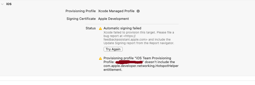 The error message states that the provisioning profile named "iOS Team Provisioning Profile" doesn't include the entitlement com.apple.developer.networking.HotspotHelper.